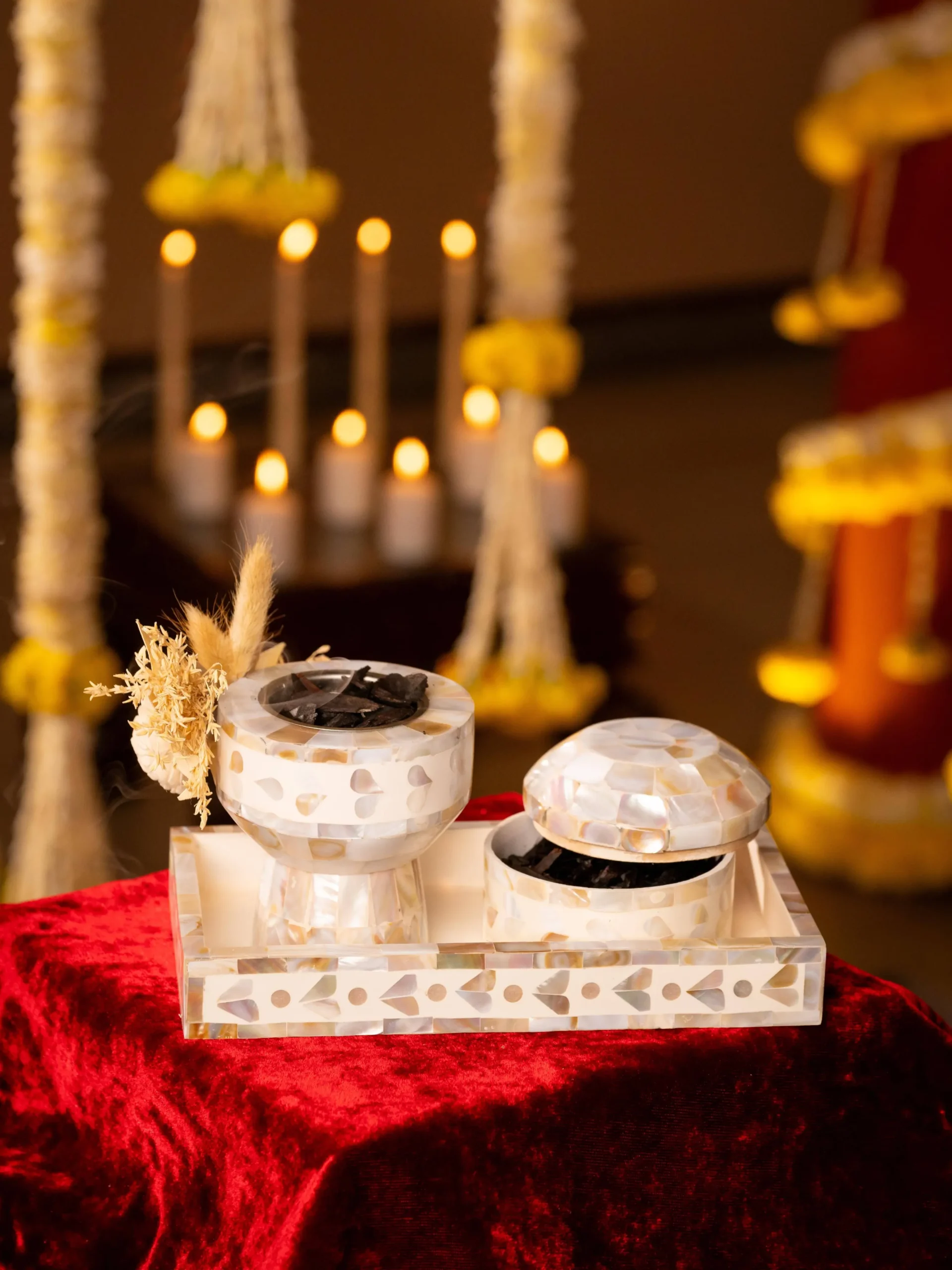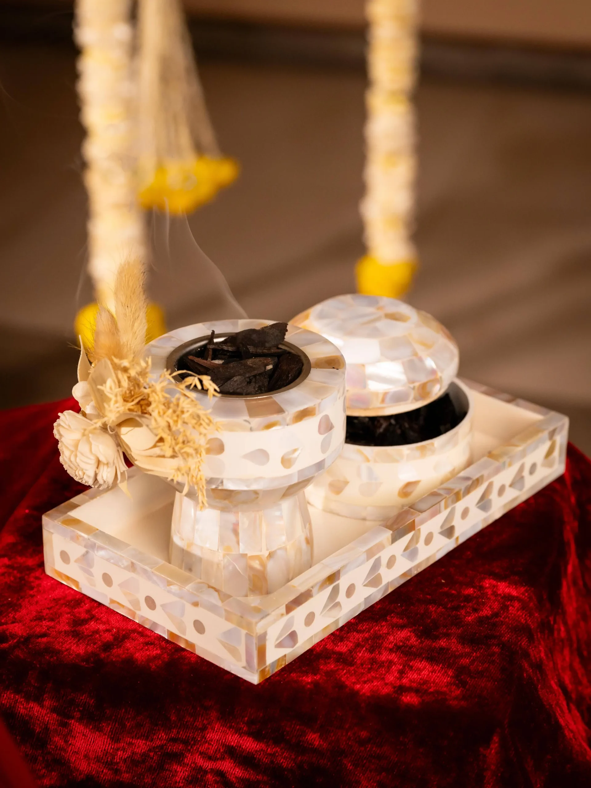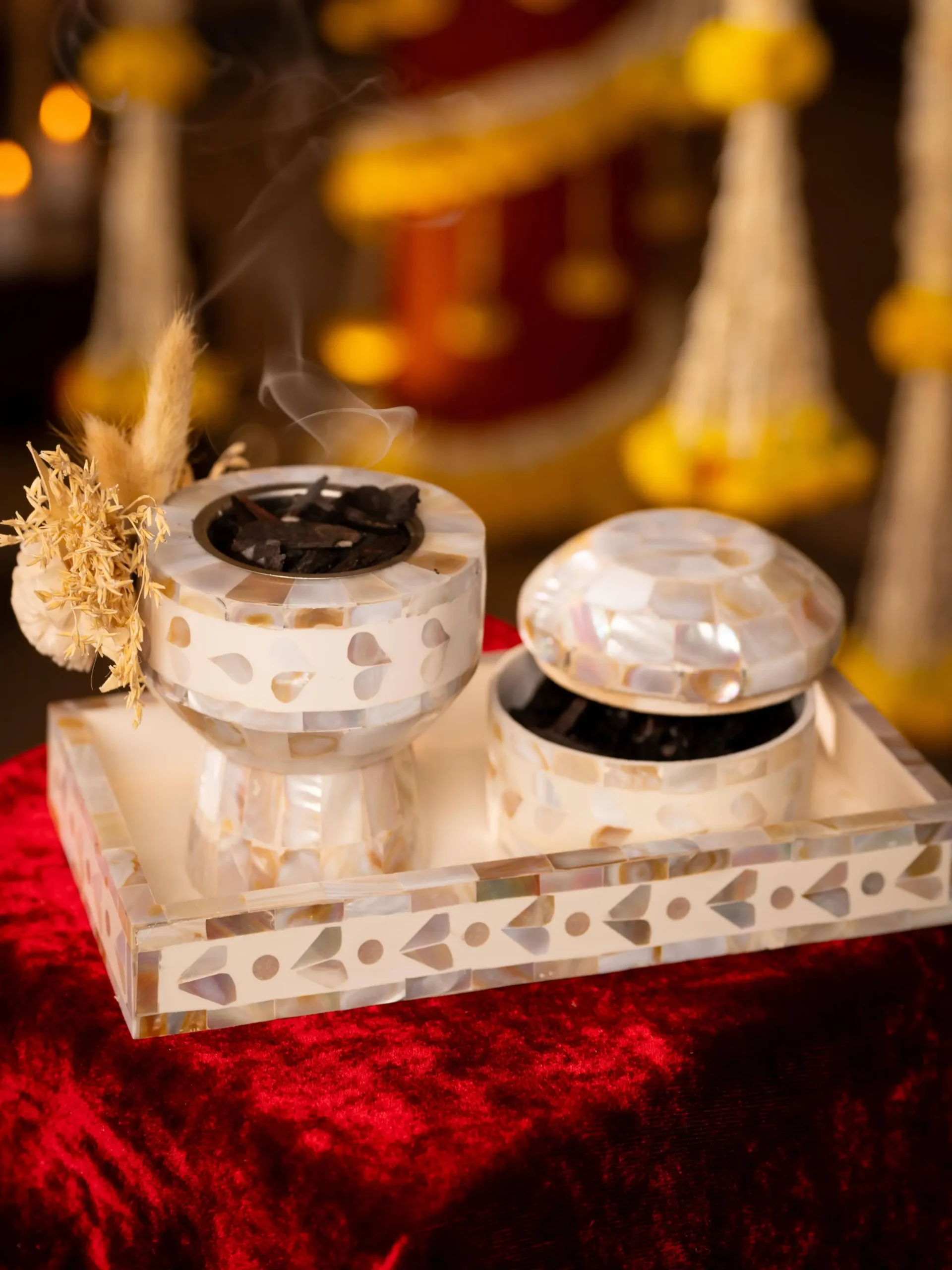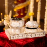A refined fusion of tradition and modern luxury, The Luxe Oud Experience Set elevates every aromatic ritual. Hand-crafted from lustrous Mother of Pearl, this exquisite ensemble is designed to infuse spaces with warmth, purity and timeless grace perfect for weddings, festive gifting and premium hospitality.