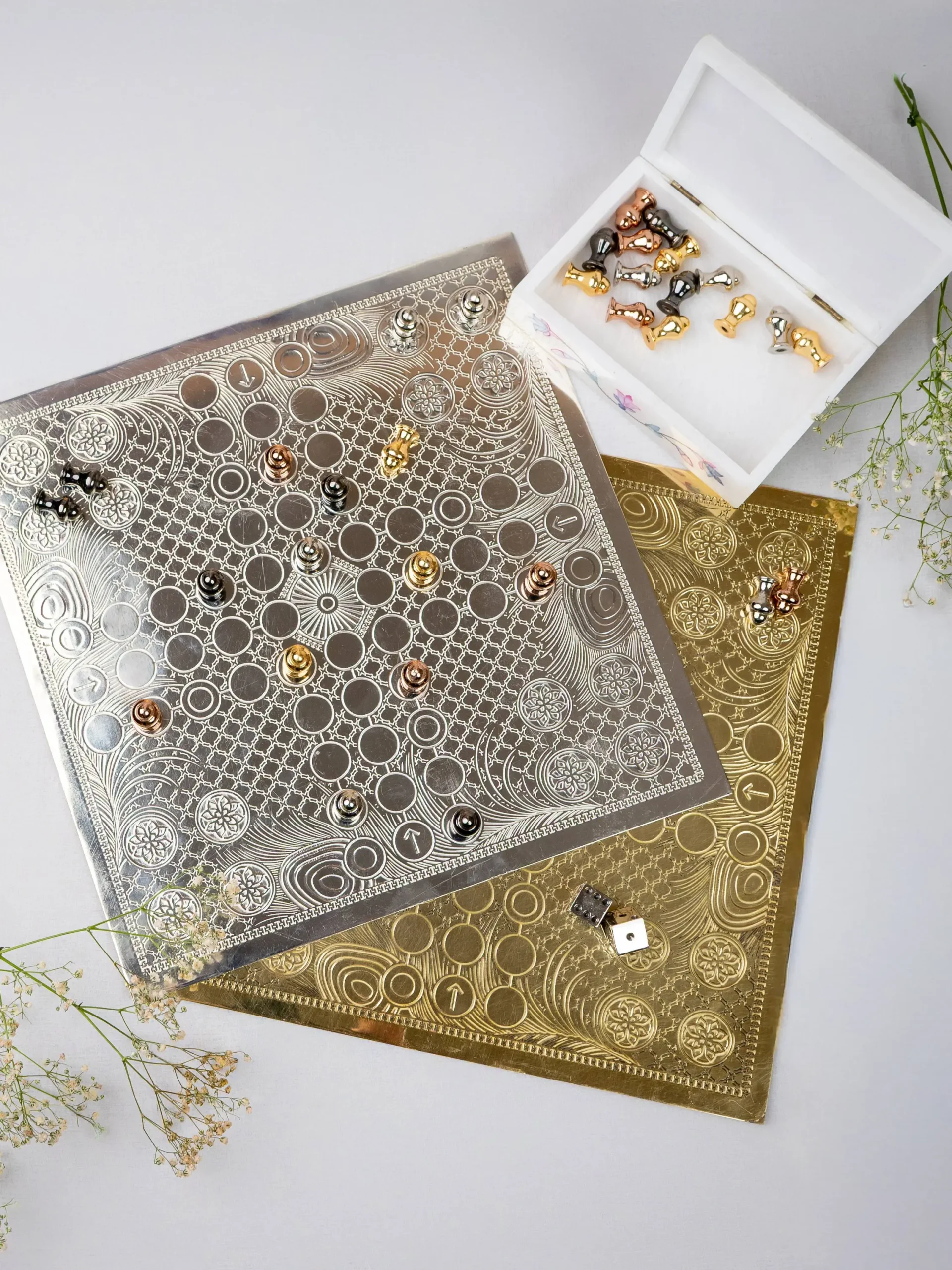 A luxurious take on the classic Ludo boardfully handcrafted in brass with engraved motifs and premium metal pawns. A perfect blend of nostalgia and opulence, ideal for family gifting and table games.
